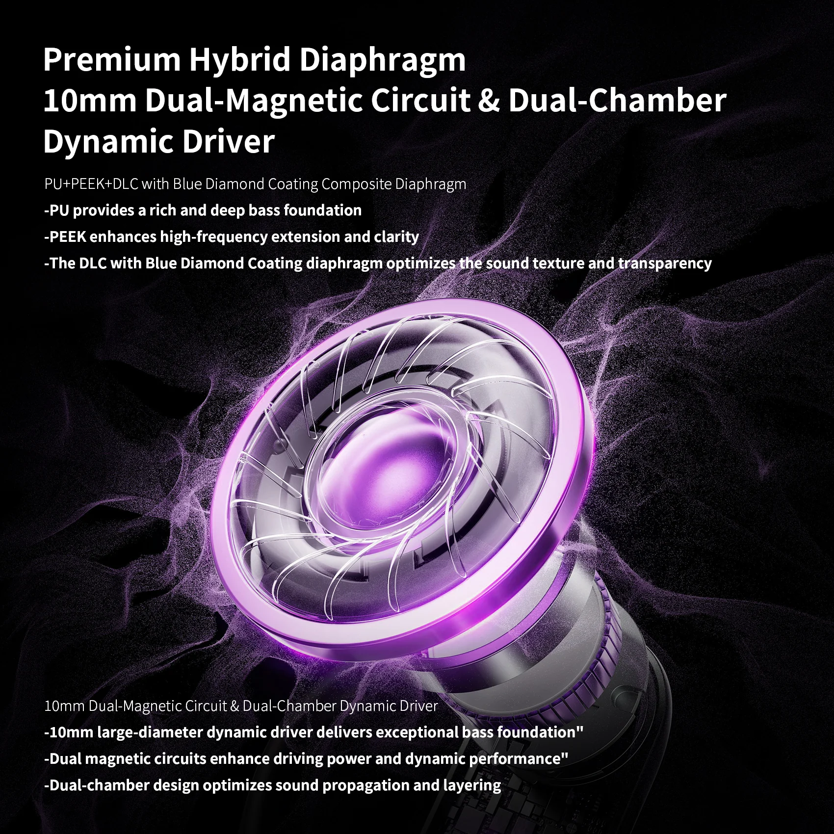 The driver itself sports a PU+PEEK+DLC with Blue Diamond Coating Composite Diaphragm. If you are wondering what all the acronyms stand for, worry not, we can decipher that together. PU is polyurethane, a soft polymer that is usually employed for parts of the diaphragm that require ample movements. You guessed it, it is the part that deforms the most and it is responsible for bass. PEEK is a polyether-ether ketone copolymer, a relatively stiff one, making up the dome of the diaphragm. This area needs to remain stiff in order to vibrate very quickly and with high displacement, but with little deformation. In order to further increase the rigidity of this area, a DLC (Diamond-Like-Carbon) coating is applied on top of the PEEK. It’s called Diamond-like it is hard like diamond, but in an amorphous state, unlike diamond, which is crystalline.
